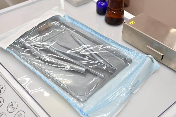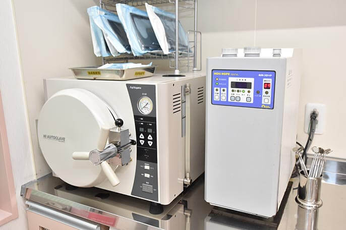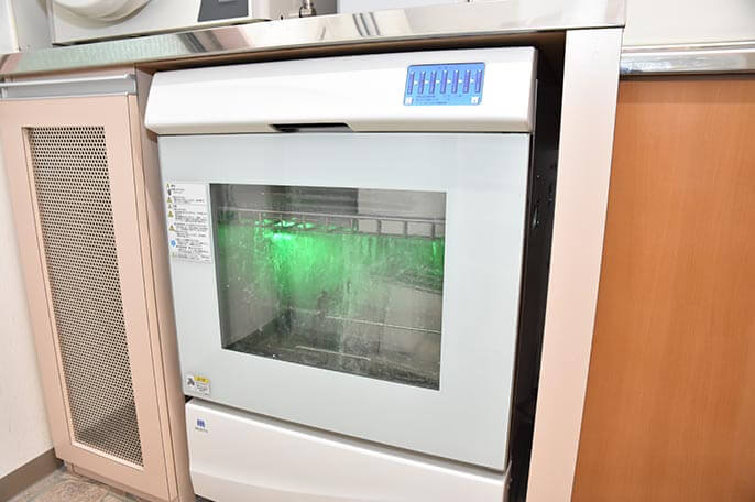 歯を削るバーや神経を取るファイル(針)、患者さんのお口に入る治療器具は、洗浄機やガス滅菌を併用し、更に完全な滅菌をオートクレーブにて行っています。