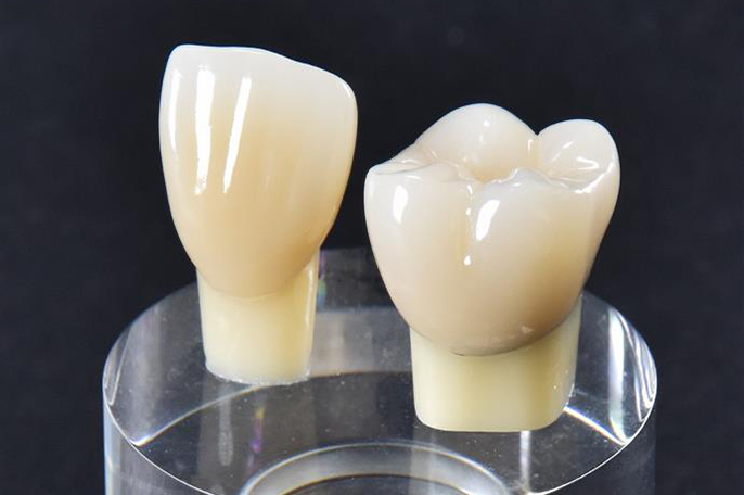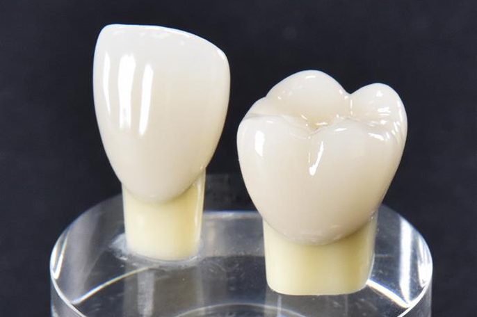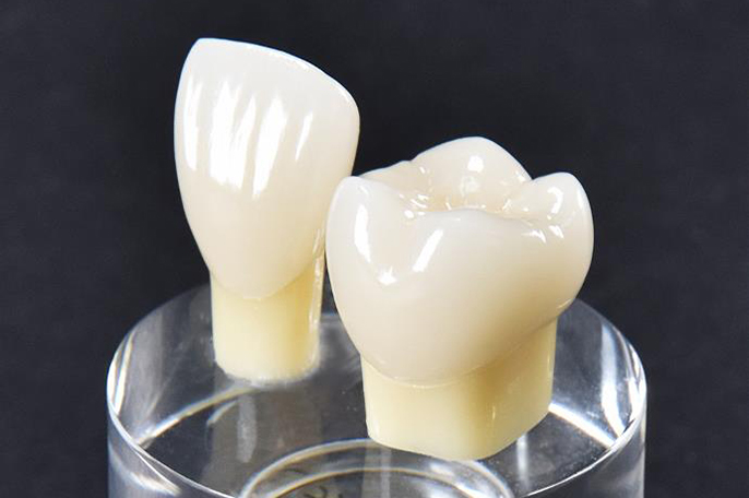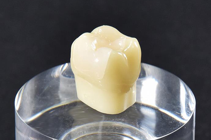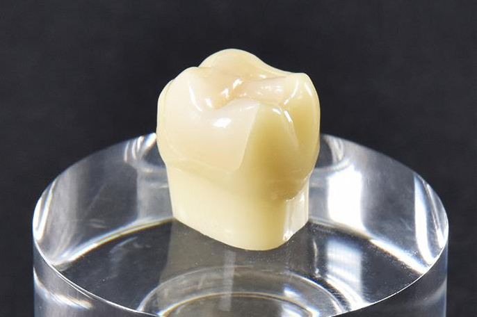 「人工ダイヤ」と呼ばれるほど高い強度があるため、咬み合わせの強い部位にも使用できます。金属アレルギーの心配もありません。白色で変色しにくく、汚れ(プラーク)が付きにくいという特徴があります。