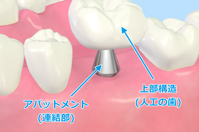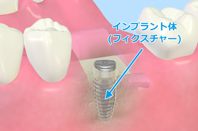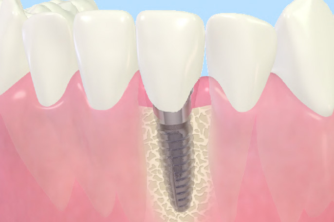 インプラントとは天然歯根の代用となる人工歯根(チタン製)のことです。インプラントを顎の骨に埋め込み、その上に人工の歯を作ります。
