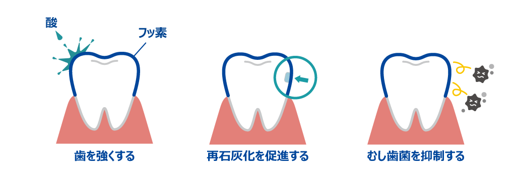 フッ素が歯に取り込まれ、酸に溶けにくい強い歯を作ります。