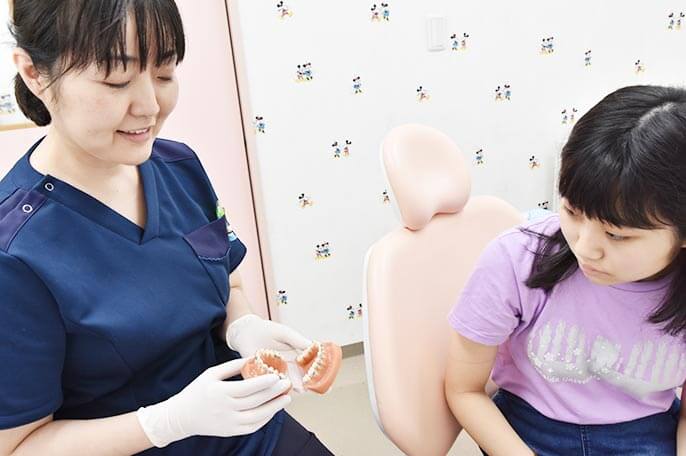 お子様にブラッシングの楽しさや、目的を覚えてもらうために、ブラッシング指導を行っています。間違った方法を覚えてしまうと、歯や歯ぐきを痛めたり、歯磨きが嫌いになってしまうので、最初の指導が肝心です。